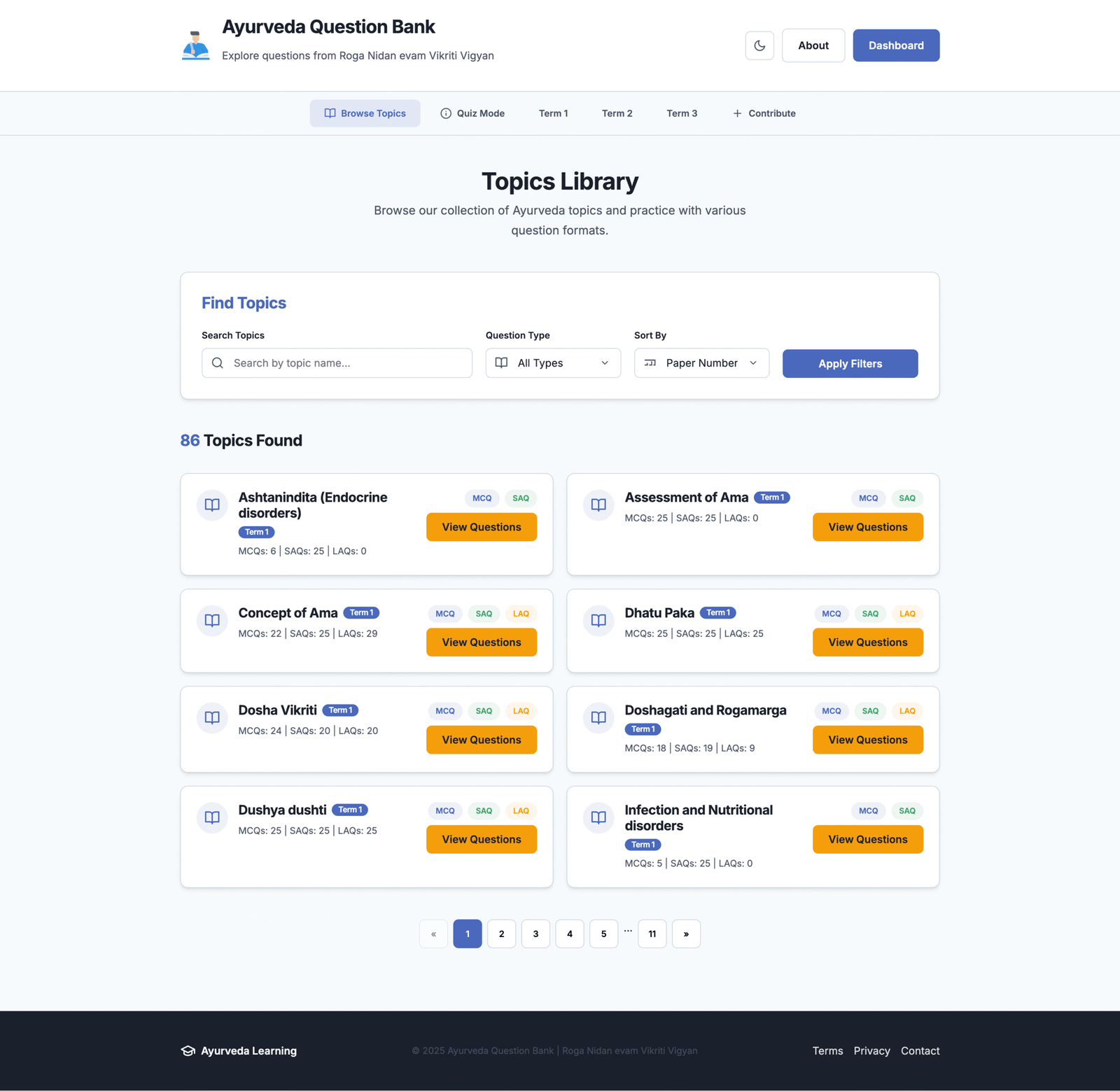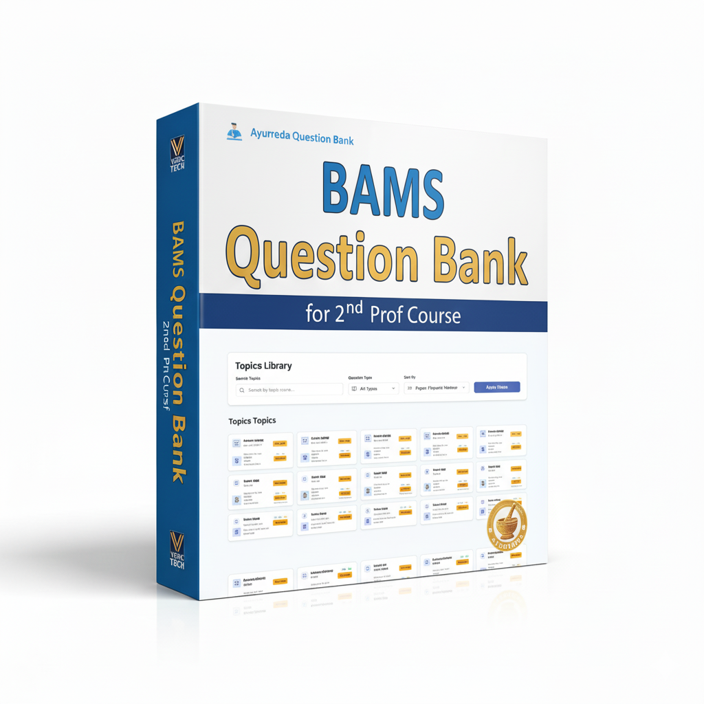 Master BAMS 2nd Prof exams with 10,000+ topic-wise MCQs, SAQs & LAQs. Covers NCISM syllabus: Dravya Guna, Roga Nidan, RSBK & more. Includes 5-Year PYQs & Custom Quiz Maker.