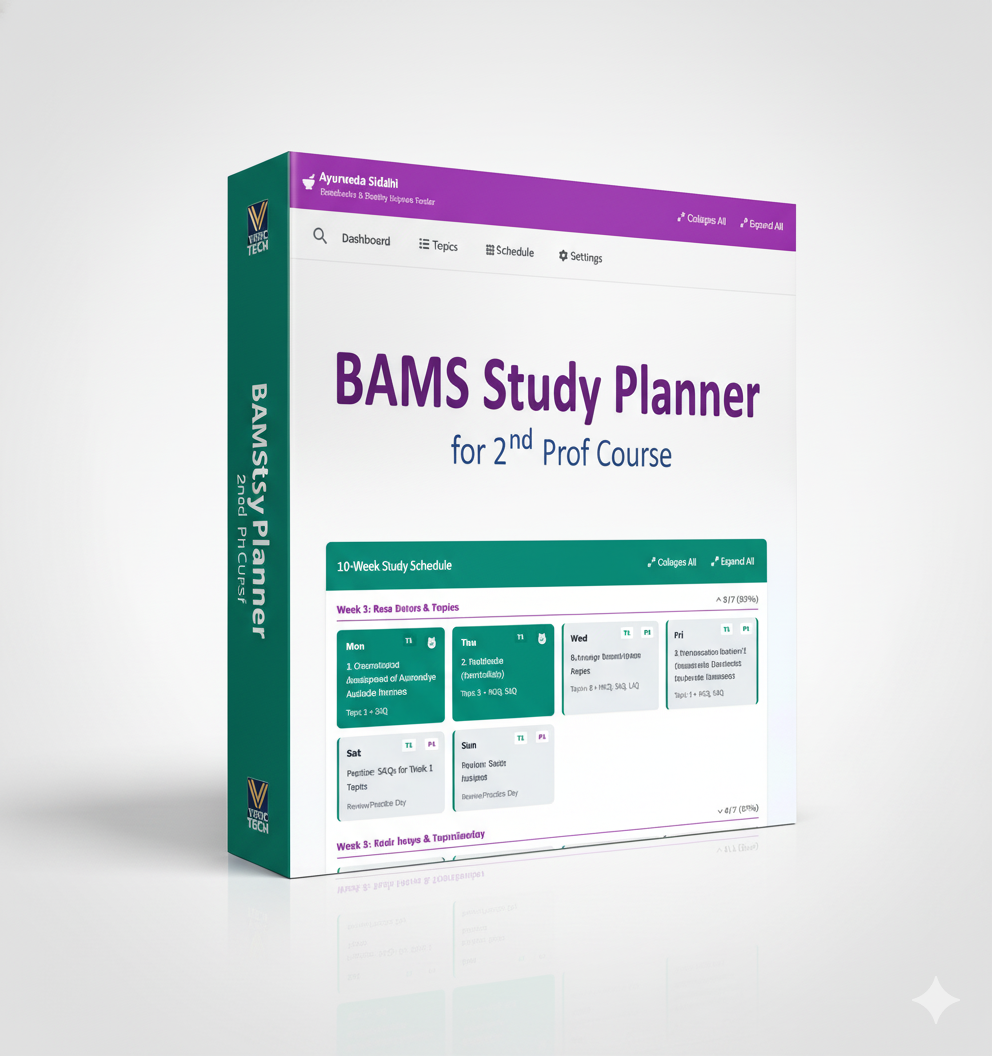 This is a Digital Study Planner specially designed for BAMS Second Professional students. It includes subject-wise planning tools for all key subjects, created according to the latest NCISM syllabus.
